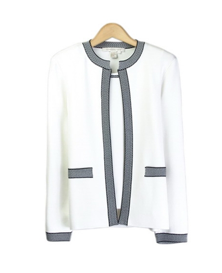 Composition's viscose nylon jewel neck long sleeve jacket is an elegant top perfect for the spring and fall seasons. Its jacquard tipping finishes this top with a classic design. This jacket matches beautifully with our matching viscose nylon short sleeve sweater. You'll love this jacket for its versatility. Hand-wash or dry clean for best results. Available in 4 beautiful colors: Black, Peanut Butter, Pink Forest, and White. Display Picture Color: WHITE